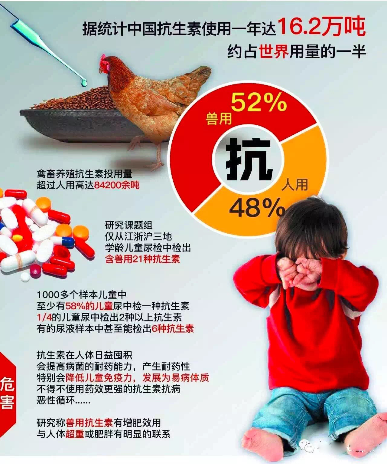 動物飼料添加抗生素能幫助動物預(yù)防疾病、促進生長,提高產(chǎn)量。但抗生素用多了,動物耐藥性增強,會出現(xiàn)一些副作用。長期食用“有抗食品”,消費者的耐藥性也會不知不覺增強,等于在人體內(nèi)埋下一顆“隱形炸彈”。